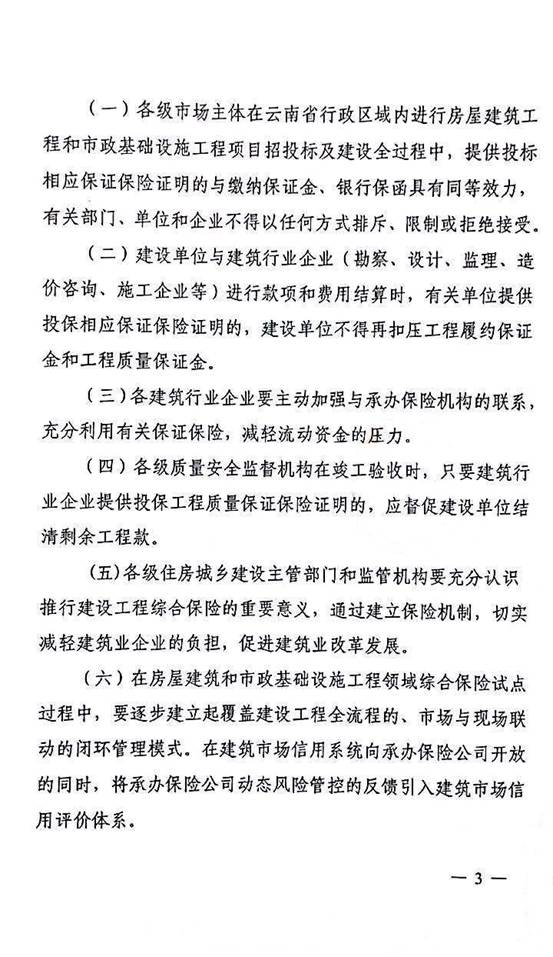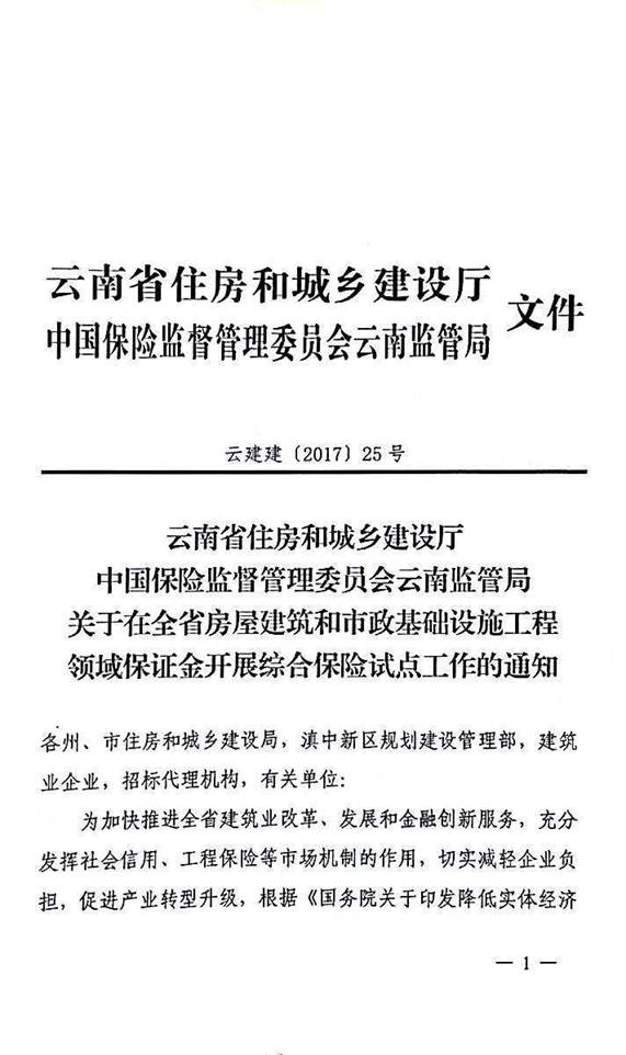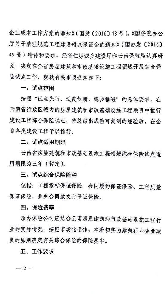 为加快推进全省建筑业改革、发展和金融创新服务,充分发挥社会信用、工程保险等市场机制的作用,切实减轻企业负担,促进产业转型升级,根据《国务院关于印发降低实体经济企业成本工作方案的通知》(国发〔2016〕48号),《国务院办公厅关于清理规范工程建设领域保证金的通知》(国办发〔2016〕49号)精神和要求,经省住房城乡建设厅和云南保监局认真研究,决定在全省房屋建筑和市政基础设施工程领域开展综合保险试点工作。现就有关事项通知如下: