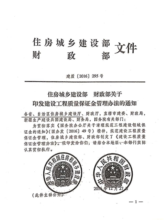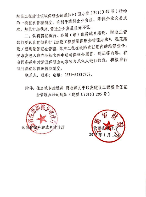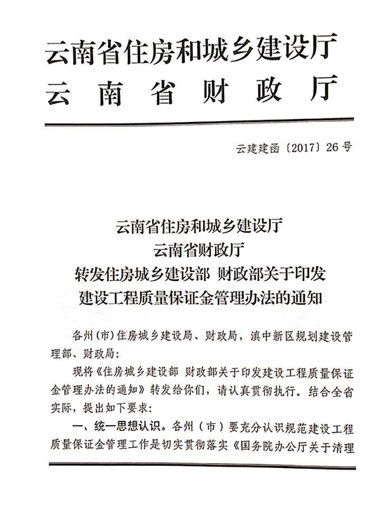 云南省住房和城乡建设厅 云南省财政厅 转发住房城乡建设部 财政部关于印发建设工程质量保证金管理办法的通知