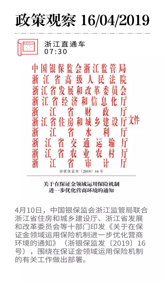 长期以来,在土地流转、诉讼保全、工程建设活动中,保证金制度一直饱受诟病:保证金的长时间冻结及难返还问题,往往给企业(特别是中小企业)带来沉重负担;保证金被占用、挪用等违规违法行为也屡屡发生,进一步加剧了企业的资金沉淀压力。响应国务院办公厅《关于聚焦企业关切 进一步推动优化营商环境政策落实的通知》中的“规范降低涉企保证金,减轻企业负担”工作要求,紧扣“放管服”改革主线与“优化营商环境”改革目标,近日浙江省发布《关于在保证金领域运用保险机制进一步优化营商环境的通知》,决定在诉讼保全、建设工程、关税支付等已经试点保证保险的领域提质增效,并加快保证保险在交通、水利工程领域及政府采购领域中的应用。