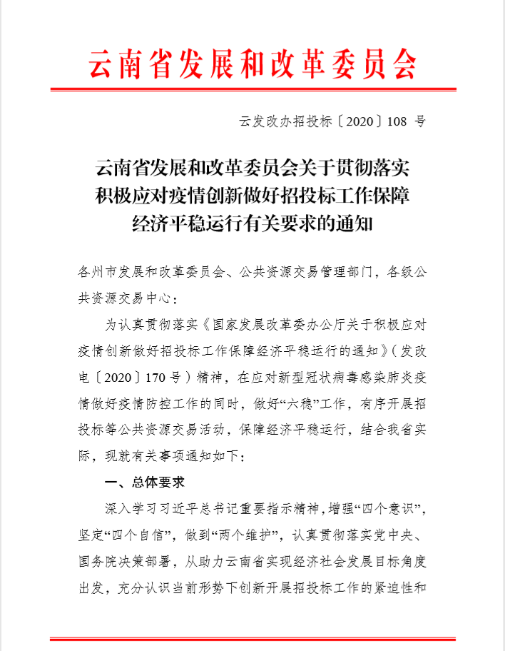 云南省发展和改革委员会关于贯彻落实积极应对疫情创新做好招投标工作保障经济平衡运行有关要求的通知
