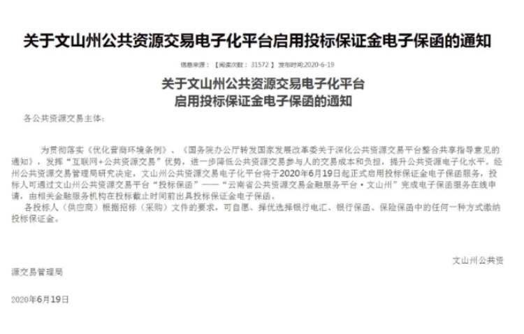 为贯彻落实《优化营商环境条例》、《国务院办公厅转发国家发展改革委关于深化公共资源交易平台整合共享指导意见的通知》, 发挥“互联网+公共资源交易”优势,进一步降低公共资源交易参与人的交易成本和负担,提升公共资源电子化水平。经州公共资源交易管理局研究决定,文山州公共资源交易电子化平台将于2020年6月19日起正式启用投标保证金电子保函服务,投标人可通过文山州公共资源交易平台“投标保函”——“云南省公共资源交易金融服务平台·文山州”完成电子保函服务在线申请,由相关金融服务机构在投标截止时间前出具投标保证金电子保函。